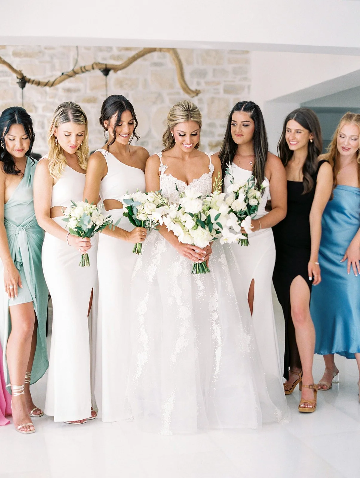 Before the ceremony began, Kali and Nicholas spent the morning getting ready in a beautiful villa on the island. The bride and her bridesmaids were all smiles as they had their hair and makeup done, sipping champagne and enjoying each other's company. Meanwhile, the groom and his best men got dressed in their sharp black tuxedos, making sure every detail was perfect for the big day. Overall, the couple's preparation exuded a refreshing and effortless charm, which blended with the island's natural beauty and laid-back atmosphere.